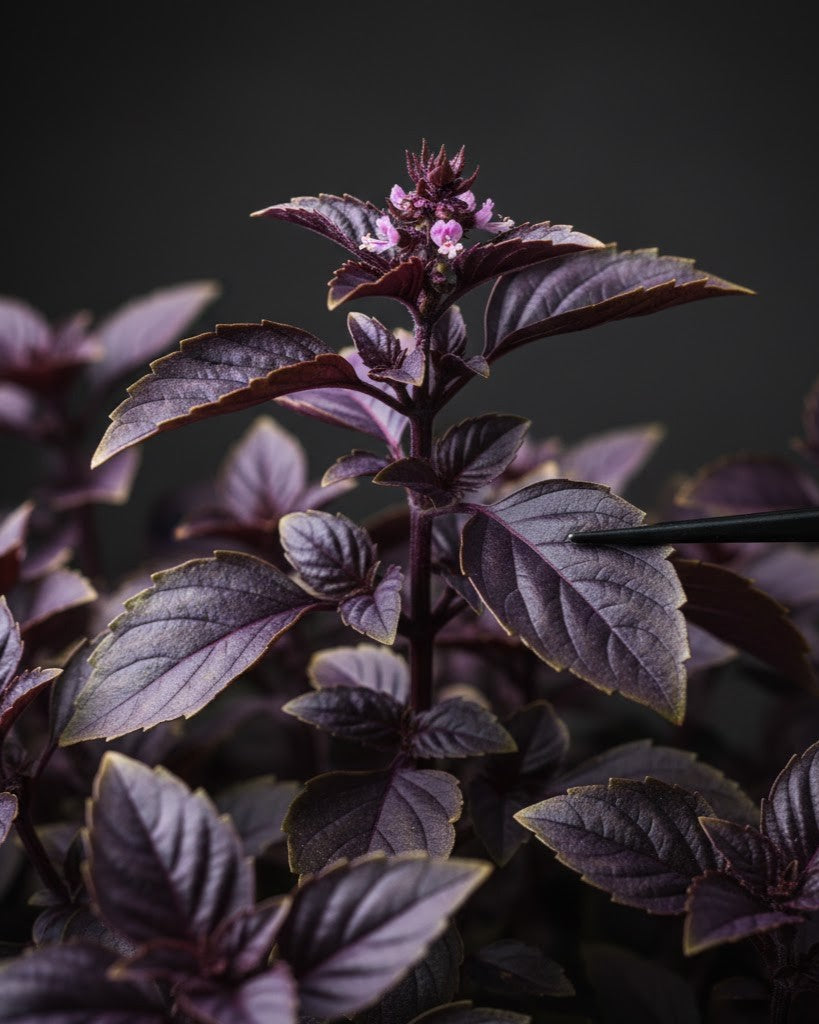 Opal basil is the purple basil. It adds a deep color pop and a strong basil aroma, perfect as a garnish and in fresh dishes.